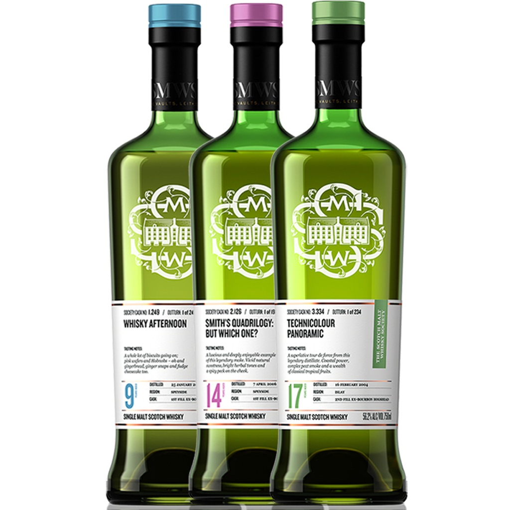 Forty years ago, a whisky lover named Pip Hills was trekking from Edinburgh to Speyside and back in his vintage Lagonda hunting for the best single casks to enjoy with his whisky-loving friends. Pip went on to found The Scotch Malt Whisky Society while laying the groundwork for the future of single cask bottlings. Let’s go Back to the Future with the first three distilleries ever bottled by the Society, a trio that any Society member should have in their collection! Cask No. 1.249 Whisky afternoon delivers the mouth-filling richness Distillery #1 is known to create. Cask No 2.126 Smith's quadrilogy: but which one? is a brilliant example of this ever-popular style from Distillery #2. Chocolate, ripe fruits and herbs combine for a hearty dose of nuanced complexity! Cask No. 3.334 Technicolour panoramic whisks us away to Islay for a peated parade of exquisite aromas and flavours so typical of Distillery #3. Peat smoke, tropical fruit and maritime delights await in this superbly textured malt matured during 17 years! Discover the complexity of these distilleries that paved the way for so many taste adventures over the past four decades!