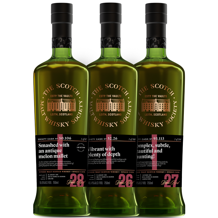 Share this profound trio with only the closest of friends. Black Tie Affair invites a deep dive into the exhilarating world of our ‘Old & dignified’ flavour profile. Cask 50.106 Smashed with an antique melon mallet starts the flight in Lowland style with a divinely delicate delivery. Cask 52.26 Vibrancy and plenty of depth offers coastal elegance and silky texture from a storied Highland distillery. Cask 93.113 Complex, subtle, beautiful and haunting! slowly reveals floral, earthen and spice aromas and flavours in a fashion as alluring as the place from whence it came. All three casks are resplendent with precision, grace and charisma for an unforgettable journey.