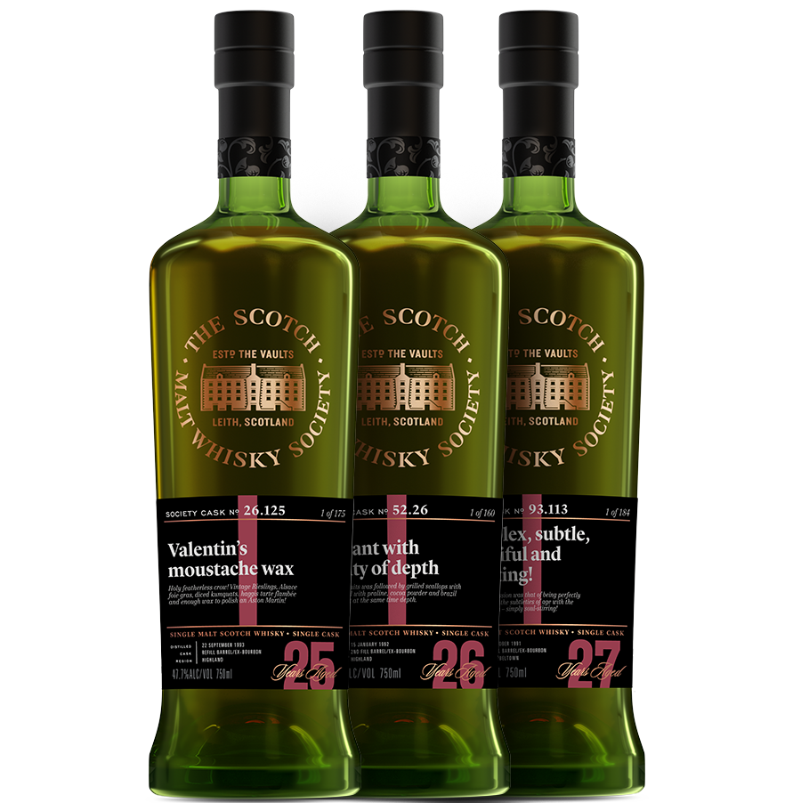 Share this profound trio with only the closest of friends. Black Tie Affair invites a deep dive into the exhilarating world of our ‘Old & dignified’ flavour profile. Cask 26.125 Valentin’s moustache wax starts the flight in Highland style with a richly textured delivery. Cask 52.26 Vibrancy and plenty of depth offers coastal elegance and silkiness for the lover of detailed nuance. Cask 93.113 Complex, subtle, beautiful and haunting! slowly reveals floral, earthen and spice aromas and flavours in a fashion as alluring as the place from whence it came. All three casks are resplendent with precision, grace and charisma for an unforgettable journey.