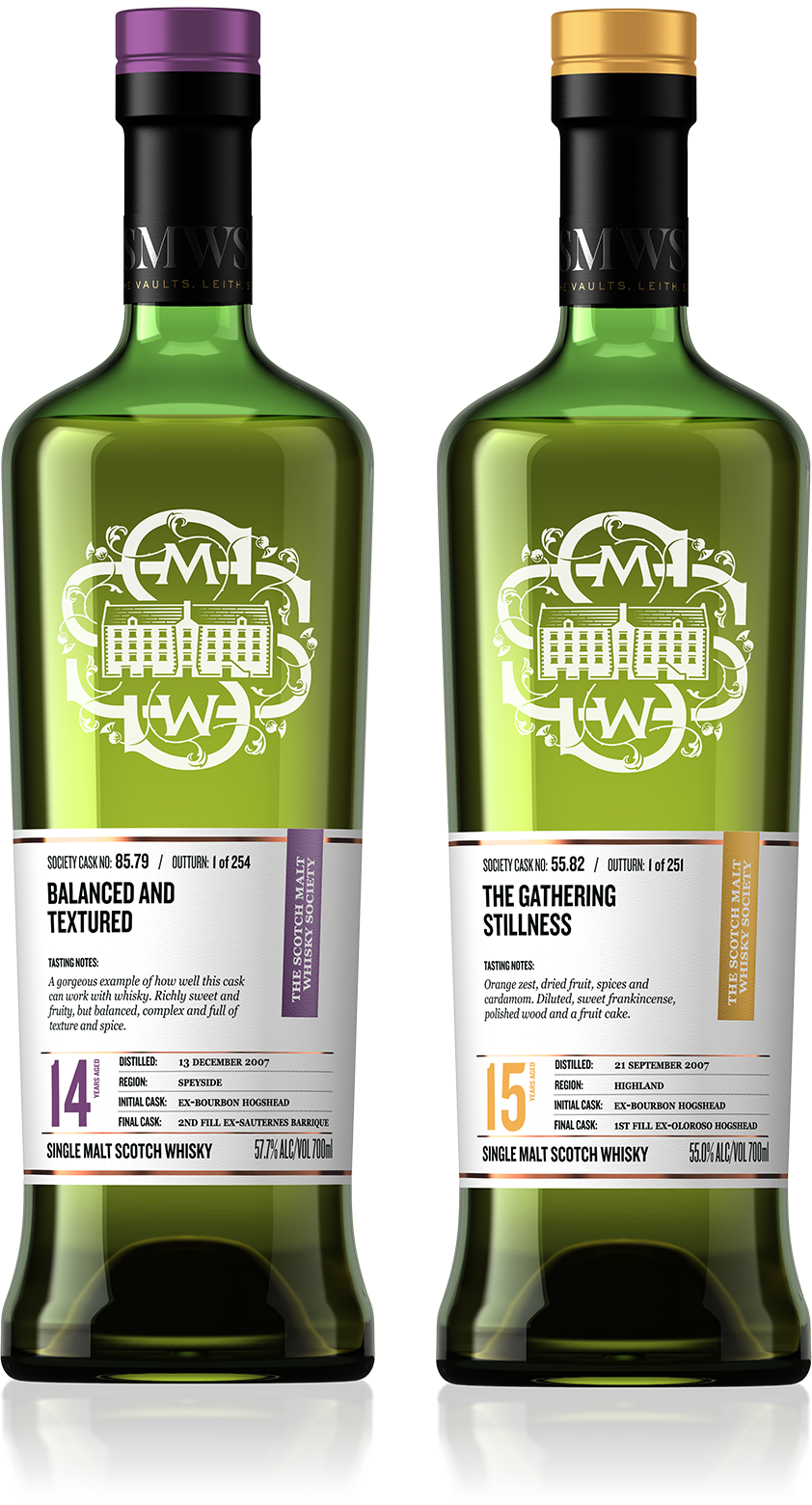 At The Scotch Malt Whisky Society, we love deeply complex and flavourful whisky in our glass. One way to achieve this is through secondary maturation in a wine cask. Here we have two different wine casks on feature – French dessert wine and Spanish sherry – to create a super-bloom of flavours! Cask No. 85.79 Balanced and textured offers up a rich profile of honey, vanilla, orchard fruits and bold spices from time in a 2nd fill Sauternes cask (Suaternes is a sweet white wine from France, made from Sauvignon Blanc and Semillon grapes). Cask No. 55.82 The gathering stillness is one of those sneaky delicious Oloroso sherry casks that was assigned a different flavour profile from the classic "Deep, rich & dried fruits". Don't let this pass you by with notes of red fruits, raisins and nuts with a creamy texture and depth that will beguile your senses!
