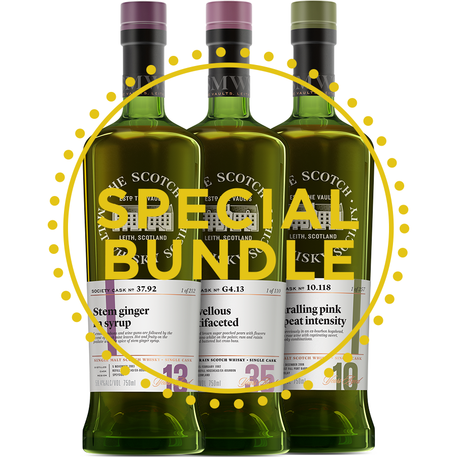 The Blooming Bundle brings together three unique casks with wildly different profiles. Our spicy & sweet Speyside Cask 37.92 Stem ginger in syrup marries the austere house style with a luscious kick for complexity. Cask G4.13 Marvellous multifaceted brings hedonistic grain character and silken texture to the palates of members after 35 years of aging. Finally, Cask 10.118 Enthralling pink and peat intensity harnesses the colour (what colour!) and flavour of its first-fill Port barrique perfectly….an exhilarating ride of smoke and confection awaits!