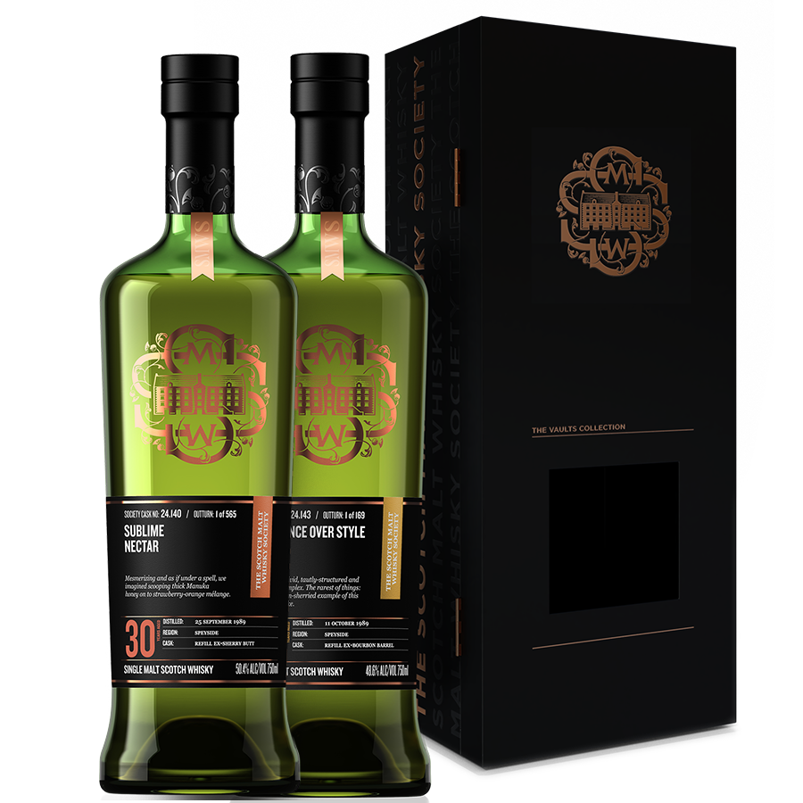 The Ultimate Vaults Collection features two different Vaults Collection casks will take you on a remarkable gustatory adventure from the monumental Speyside Distillery #24! Cask No. 24.140 Sublime nectar spent 30 years maturing in a refill Sherry cask, creating an utterly stunning tasting experience our Tasting Panel described as “mesmerising” on the nose and “sublime” on the palate. The sherry character shines through deliberately yet delicately, offering much nuance to be discovered over time in the glass. Cask No. 24.143 Substance over style reveals a bold and beautiful side of the distillery style, having been aged 30 years in a refill ex-bourbon cask. Here, we discover just how much depth of flavour is possible from this distillate in the absence of sherry maturation. A divinely fragrant and complex malt awaits with so much to uncover! Anchored by malty richness, your palate will be treated to decadent flavours and superb texture that makes you realize you’re in the presence of greatness. Don’t let this amazing gift to yourself or that extraordinarily special someone pass you by!