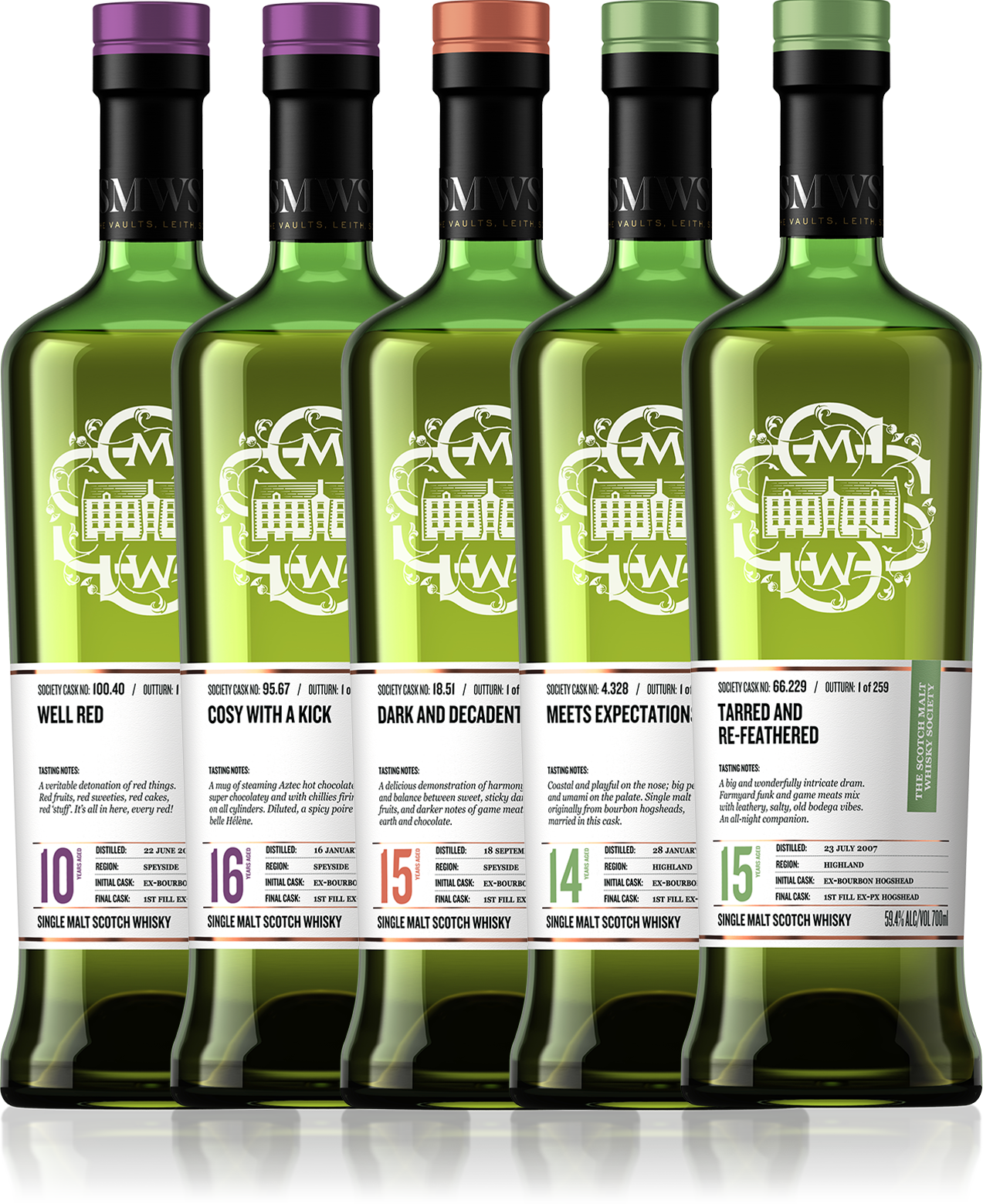 The Gathering High Five bundle offers a master class in cask maturation for you and your whisky-loving friends to enjoy! This high five of flavour is certain to impress. We kick things off with a unique red wine maturation in Cask No. 100.40 Well red. An Australian Shiraz cask endows the Speyside dram with ripe cassis and Port notes to complement vanilla sweetness and pleasing spices. Cask No. 95.67 Cosy with a kick features maturation in a PX hogshead delivering rich and spicy chocolate, baking spices and more in this bold malt. We switch to Oloroso sherry with Cask No. 18.51 Dark and decadent where dark chocolate is joined by darker beer, dark fruits and black liquorice. This palate has plenty of depth and nuance to coax out of the glass. We switch gears to peated whisky now, with selections from the Orkney Islands and Eastern Highlands. Cask No. 4.328 Meets expectations presents a lovely dram with the perfect combination of elegant smoke and maritime complexity whilst Cask No. 66.229 Tarred and re-feathered is a wee bit more outspoken in the glass as peated malt and PX sherry maturation join forces. The result is a boisterous and beautiful expression redolent with campfire smoke, game meats, dark confections and whiffs of Islay-inspired tar and iodine. A real stunner! We hope this gathering of Society casks will provide much pleasure for your gathering of like-minded whisky explorers!