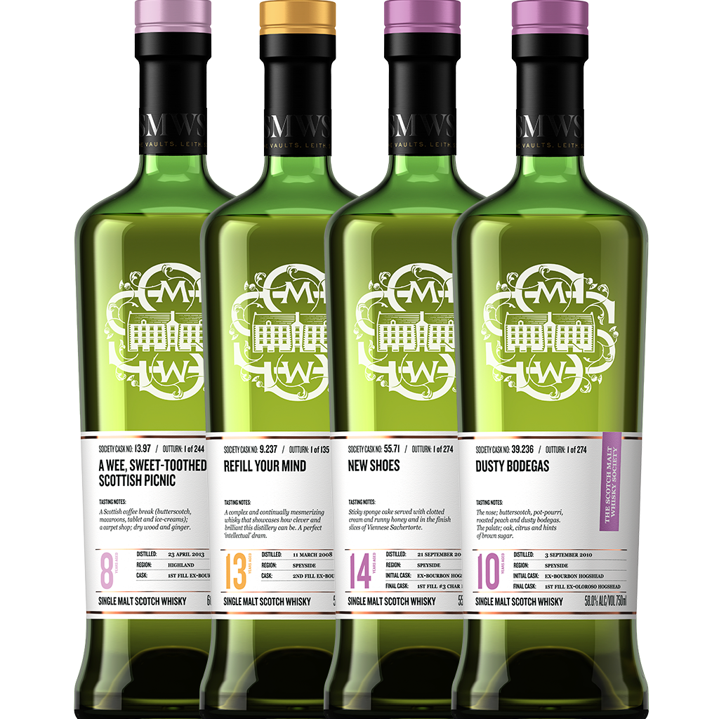 A cornerstone of the Society experience is to discover through sharing drams with like-minded whisky lovers. The Thrill of the Taste bundle is a killer quartet of flavour certain to get the cask strength conversation rolling! We commence with a ‘Young & Spritely’ Cask No. 13.97 A wee, sweet-toothed, Scottish picnic. This flavour profile tends to invigorate the tastebuds as an opening salvo and the expression’s combination of creamy sweets and gingery spice checks all the boxes. Cask No. 9.237 Refill your mind offers a ‘Spicy & Dry’ flavour profile very rarely seen from this distillery. Citrusy and tropical with lovely minerality, floral and barley character for a refreshing take on this member favourite. Our next two casks offer very different sides of the ‘Sweet, Fruity & Mellow’ profile – Cask No. 55.71 New shoes delivers silky sweetness and a dose of spice from time in a charred hogshead whilst Cask No. 39.236 Dusty bodegas dotes on the floral and fruity side of sherry maturation. A fascinating juxtaposition of flavours and a proper conclusion to this first-class flight!
