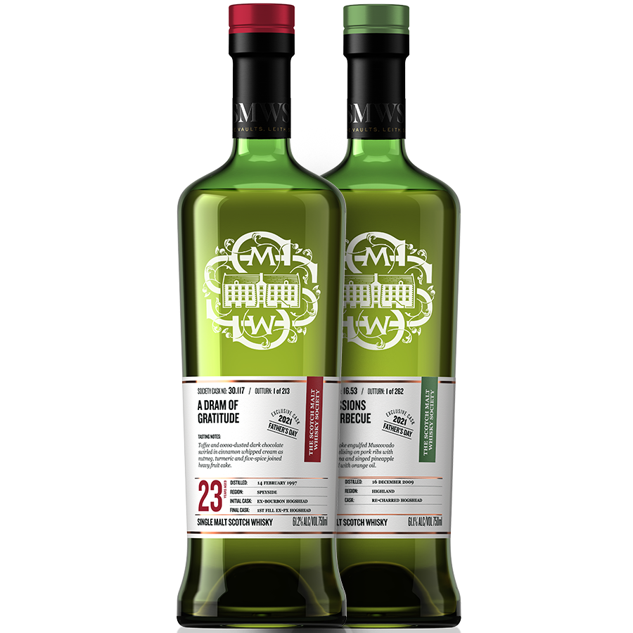 Celebrate Father's Day in cask strength style with two USA Exclusive Society casks chosen specifically for Father’s Day by your SMWS America Team! Cask 30.117 A dram of gratitude is the ultimate sherry lover’s dr(e)am. Exploding with aromas and flavours of dark desserts, dried fruits and the entire spice cabinet, this magnificent twenty-three-year-old malt offers waves of richness and depth. Twenty-one years in ex-bourbon wood and two additional years in a PX hogshead has created a dram that any whisky enthusiast can’t help but fall in love with. Our second Cask 16.53 Confessions of a barbecue bears the perfect name and expression for peat freaks across the country! Huge plumes of smoke enrapture your tastebuds with woodsmoke, sticky barbecue, vanilla, spicy chocolate and so much more gorgeous smoke! This eleven-year-old malt spent its entire maturation in a re-charred hogshead and represents a stellar Highland expression of peated whisky. Separately, these casks will be a wonderful treat for any scotch enthusiast…..together, they are The Whisky Lover’s Dream! That’s right, a richly sherried cask has been bundled with a heavily peated cask, thus showcasing the two most expressive whisky styles for a Father’s Day to remember! Offer this perfect pair to the father in your life and treat him to an unforgettable whisky epiphany only Society malts can afford. Maybe that father is you and it’s time to treat yourself to some trophy bottles for your collection! Whoever ends up with this most complementary pair of USA Exclusive Father’s Day casks will revel in the sensory excitement that is to come!