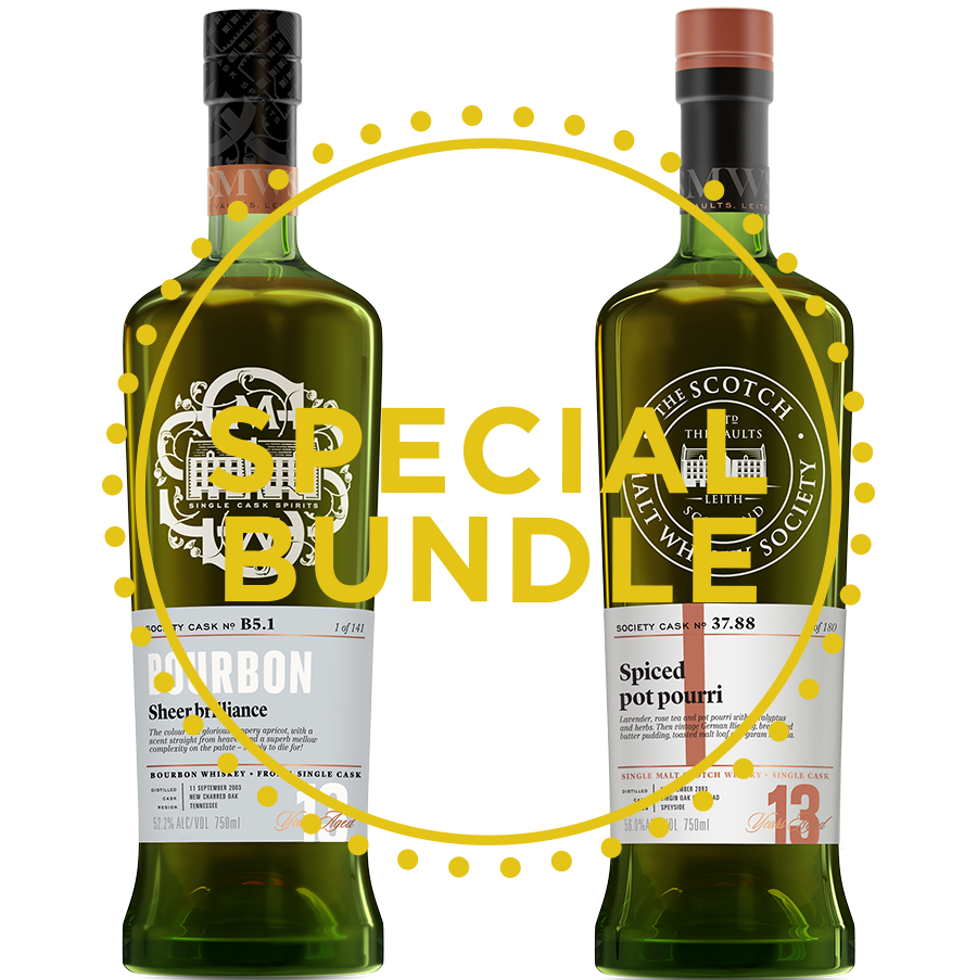 Whiskey! Whisky! invites curious palates to compare and contrast two individual spirits side by side. Different countries of origin and mash bills will provide a nice juxtaposition for these two drams, while their ages are identical and barrels are very close in constitution, size being the differentiating factor. Celebrate the uniqueness each brings to the table while marveling in their shared sophistication. Cask B5.1 Sheer Brilliance and Cask 37.88 Spiced pot pourri will make a dashing duo in a comparative tasting!