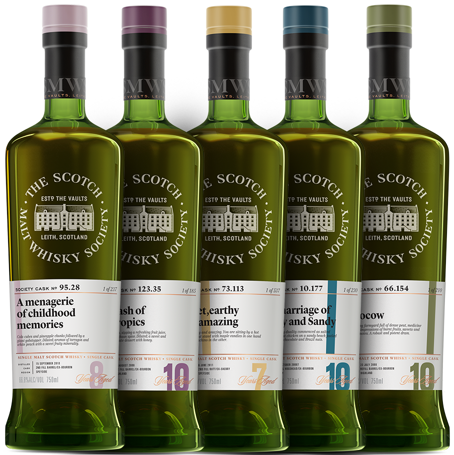 Is the weather outside getting frightful? Fear not….our Winter Warmers bundle will surely warm your bones and tantalize your senses! This full-throttle quintet sports serious intensity for a wonderfully warming experience. Start with young & spritely Cask 95.28 A menagerie of childhood memories for a neat profile redolent with tropical fruit and confection before the addition of water coaxes out the herbaceous elements of this classic Speysider. A spicy and sweet Highlander will whisk you away to warmer regions with Cask 123.35 A splash of the tropics - rich tropical fruit appeal and peppery spice will have you singing Mele Kalikimaka. Cask 73.113 Sweet, earthy and amazing is a stunning example of full-term Oloroso sherry cask maturation. This spicy & dry malt combines a natural complexity with even more from the European oak. Dried fruits, leather and spice will scintillate the senses. Oily & coastal Cask 10.177 The marriage of Candy and Sandy evokes coastal salinity with sweet and savoury fare for a texture-driven jaunt in Islay. Finish your tasting with perfectly peated Cask 66.154 Robocow. We go from the coast of Islay to the farmland of Aberdeenshire with this dram. Earthy and slightly medicinal aromas are joined by smoked meats and confection on the complex palate. And now an announcement from your captain….you are flying at an altitude of nearly 60% ABV (and higher!) so welcome aboard and enjoy the flight!